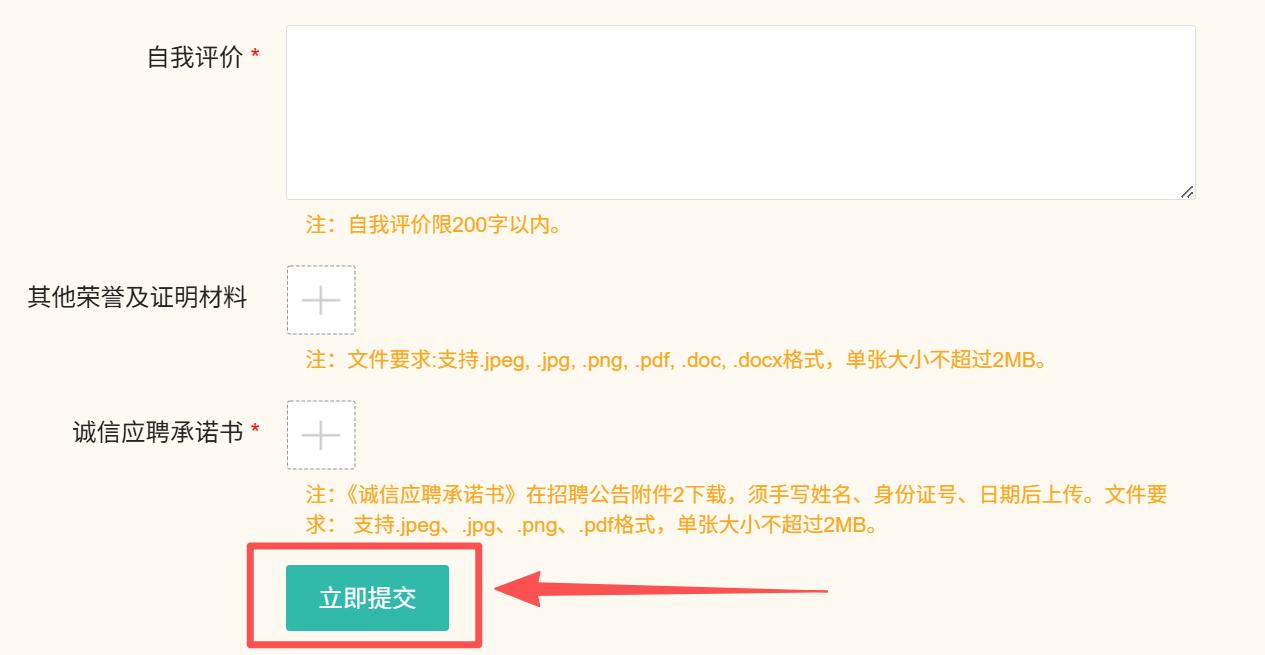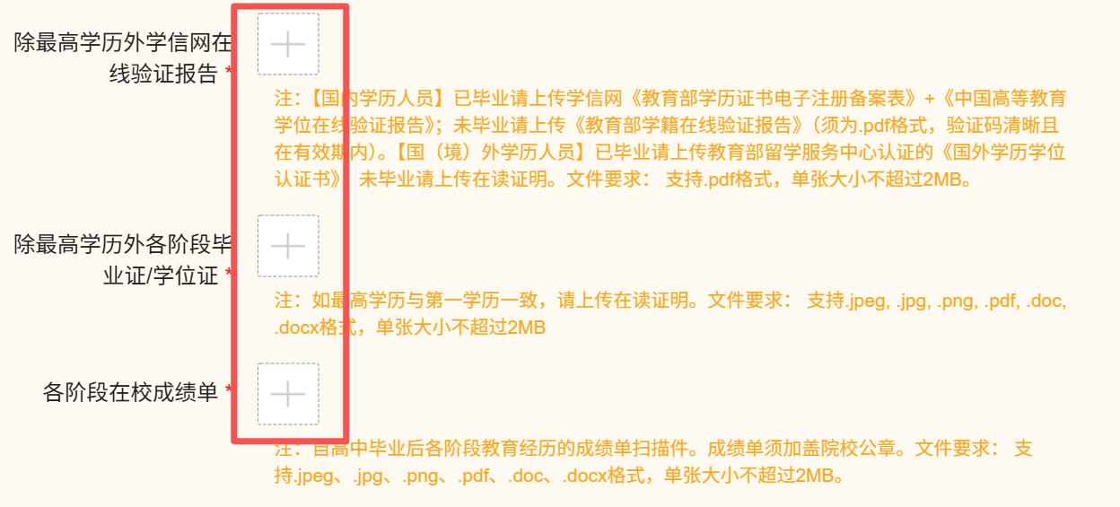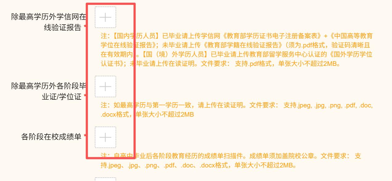 3.准备报考材料:根据报名提示上传资料,包括本人一寸免冠照片、本人有效期内二代身份证正反面、各阶段教育经历的学信网在线验证报告(PDF格式,验证码清晰且在有效期内)、毕业证/在校生证明、各阶段在校成绩单、荣誉及奖项、诚信应聘承诺书(须手写姓名、身份证号及日期)等资料。