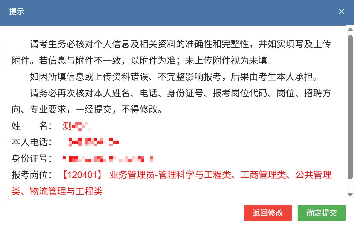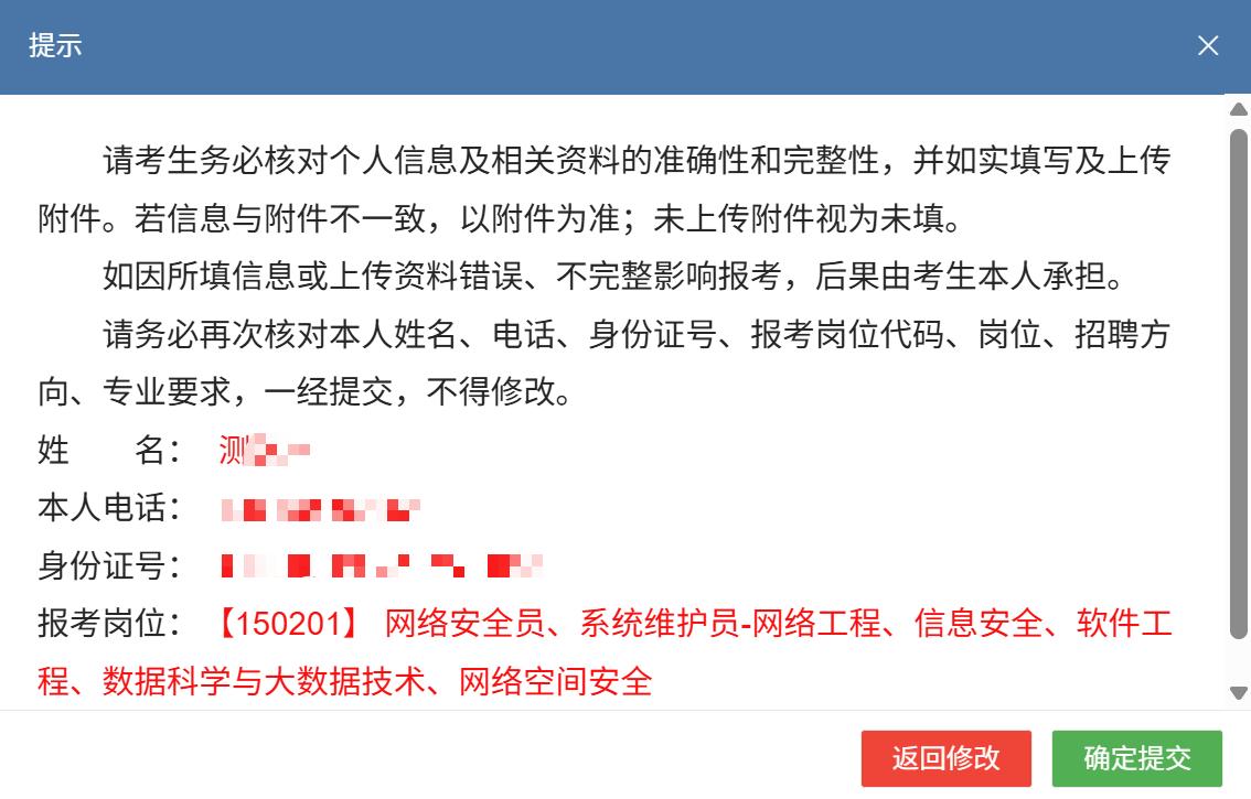 4.填写报名:在官方报名通道规定的时间内进行报名,认真填写个人信息,填写完成后点击【提交报名】按钮,系统将弹出窗口,请再次核对姓名、身份证号码、本人电话及报考岗位是否准确无误,一经提交不得修改。如下方(图三、图四、图五、图六)所示。
